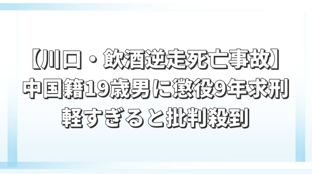 埼玉県川口市で起きた飲酒逆走死亡事故。19歳の男に対して検察が「懲役9年」を求刑しました。 ですが、この数字を聞いた多くの人が「短すぎる」と感じています。飲酒、逆走、時速125キロという危険運転で人の命を奪ったのに、たった9年?という疑問がわく... -